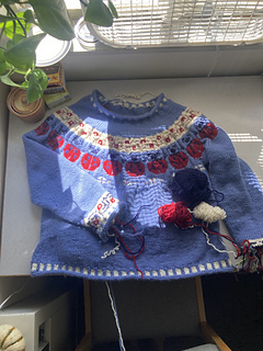 This is a pattern for a stranded colourwork pullover. It is worked in the round and from the top down.