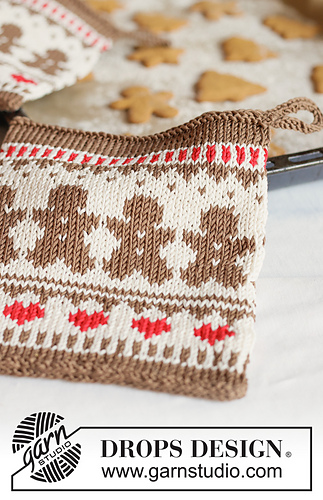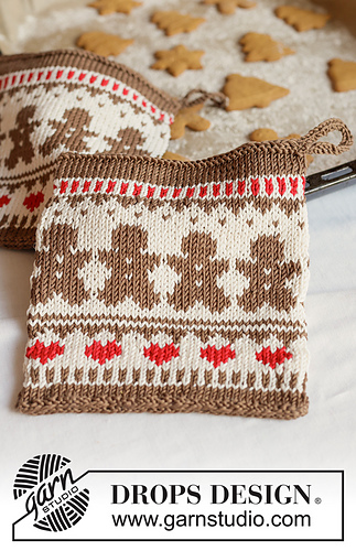 Knitted potholders with Nordic pattern, gingerbread cookies and hearts in DROPS Muskat. Theme: Christmas.