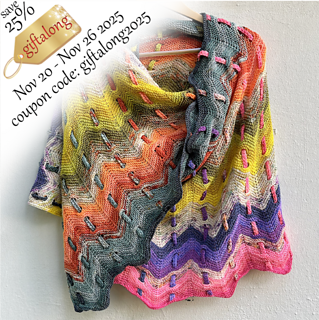 „24 SKEINS GO CRAZY“ ist eine Weiterentwicklung meines METRO LINES WRAP – ein buntes, rechteckiges Tuch, das mit durchgeflochtenen Kraus-Rechts-Bändern spielt. Anstelle eines simplen Rechtecks wird hier aber ein ZickZack-Muster gearbeitet, das durch Zu- und Abnahmen entsteht und durch strategisch platzierte Schlitze für die später durchzuziehenden Bänder ergänzt wird. Das Design eignet sich perfekt für Woll-Adventskalender aller Art oder 24 selbst zusammengestellte Minis mit mindestens 73 m pro Strang oder der entsprechenden Menge Garn der Stärke „fingering weight“. Das Original wurde mit dem 2023er Adventskalender Farbrichtung “bunt” von Walk Collection gestrickt.
