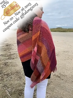 24SKEINS is a huge parallelogram-shaped shawl (size see pic) made from a total of 24 mini skeins => you need 16 fingering weight minis plus 8 mohair minis (1340 m / 1465 yards of each yarn). The fingering weight yarn and the silk mohair are held together throughout and you choose your colours at random - following a few rules - which makes it extra fun. It is also a great stash buster and looks best when you use colours from „one colour family“.