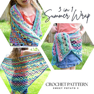 This crochet pattern comes with complete instructions for the 3-in1 Summer Wrap in a child size and an adult size.
