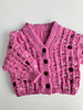 Notions: Stitch markers, locking stitch markers, 2 stitch holders for front shoulders (or the extra US 7/4.5 mm needle), 4 x 0.7”/20 mm buttons.
