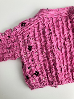 This cardigan has a wavy texture pattern created by combining knits and purls. The duplicate-stitch details give leftovers a second life!