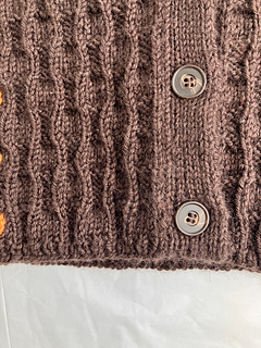 Notions: Stitch markers, locking stitch markers, 2 stitch holders for front shoulders (or the extra US 7/4.5 mm needle), 4 x 0.7”/20 mm buttons.
