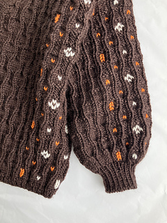 The sample was knitted in Peer Gynt by Sandnes Garn in the colourways 3082 Brown (MC), 2745 Brick (CC1) 2523 Natur Tweed (CC2)