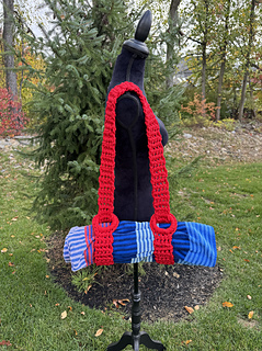 This adjustable strap, perfect for carrying your yoga mat to and from class or your rolled up beach towels at the beach, is super easy to make, using only single crochet and chain stitches and a thick T-shirt yarn.