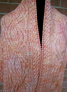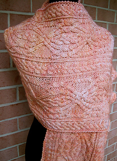 This stole is knitted with light worsted weight yarn. The sshawl is approximately 21 1/2 inches inches x 68 - 76 inches, but can be altered, and, as shown, requires approximately 950 - 1150 yards. The focal cable stitch comes to us from Canada and the creative mind of Annie Maloney.