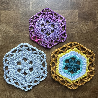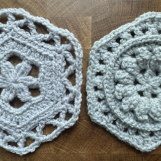 Finished hexagon is same size as solid 6 row hexagon made out of dc’s. Same goes for stitch count: one edge of the finished hexagon is 12 sts (+ 1 ch for each corner .. so finished hexagon on last round has 78 sts).