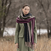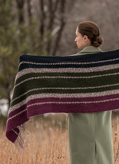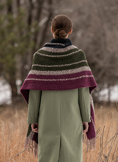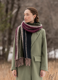Inspired by the picturesque sunsets located near mountain lakes, this colorful and moody, striped wrap is lightweight, yet warm for chilly evenings. This oversized wrap is crocheted with Woolstok and Prairie, creating a unique reversible piece.