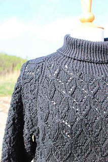 Amaline is a classic raglan pullover with a nice textured lace pattern on the body - knitted from the bottom edge and up. The pullover has a raglan yoke and sleeve construction with long sleeves and turtle neck. The pattern is made for at yarn with a gauge of 25 stitches per 10 centimeters (textured lace pattern) i.e. a yardage of approximately 190-200 meters per 100 grams.