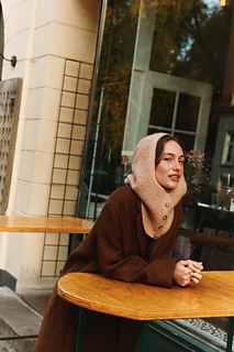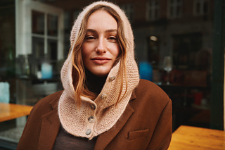 The hood is worked from the bottom up. First the back is worked and then the two fronts. After this all three parts are joined and worked together to the top of the head. A flat section is worked along the top of the head, where the center of the work is knitted together with the two sides. At the end a front edge is worked in double knitting along the fronts and around the face opening, and buttonholes are worked along one side.