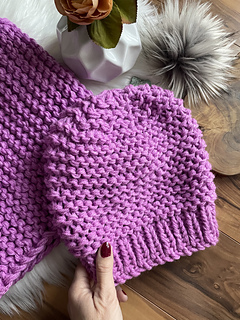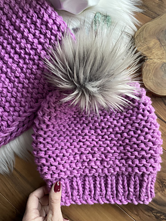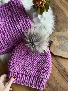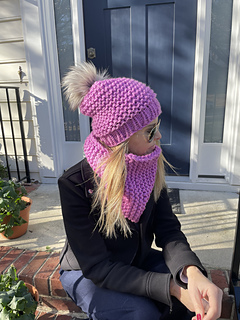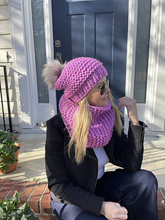 The hat is worked in the round for a seamless finish, with a soft, stretchy fabric that comfortably fits most adult heads. The coordinating cowl is equally simple, knit as a relaxing tube that sits beautifully around the neck for warmth and comfort. Both pieces are quick knits—perfect for weekend projects, thoughtful handmade gifts, or your own cold-weather wardrobe.
