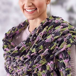 This shawl is a straight shot to keepingfashionably warm. It’s a great project forvariegated and solid colors of With Love.Pick your favorite and get stitching.