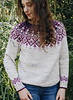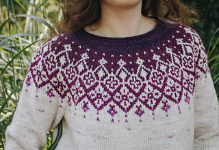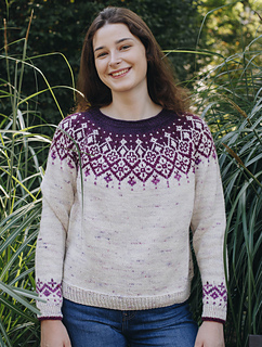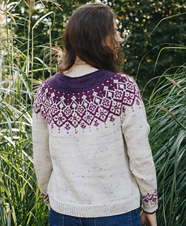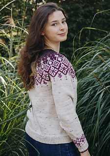 Asara is a top-down seamless yoke sweater that is knit in the round. There is a ribbed neckline followed by short rows at the back of the neck for a comfortable fit. The yoke features stranded colourwork that inverts in colour. There is optional waist and hip shaping to add feminine shape, and the hem is finished off with ribbing. The sleeves are finished off with stranded colourwork that highlight the yoke motif and ribbing. Asara was inspired by Polish embroidery from the Małopolska region.
