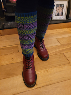 Aurelia legwarmers are knitted using traditional Fair Isle stitch patterns in rich autumnal colours of Jamieson & Smith’s pure Shetland wool. They are worked top down in the round, and corrugated ribbing has been used at the knee and at the ankle. The legwarmers are slightly shaped for a better fit.