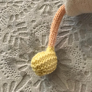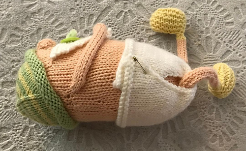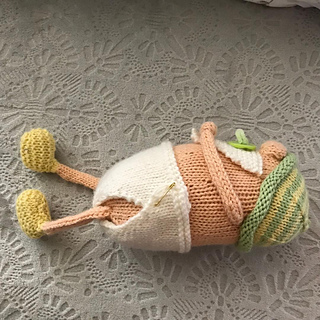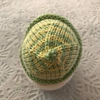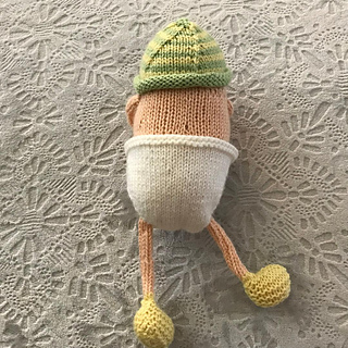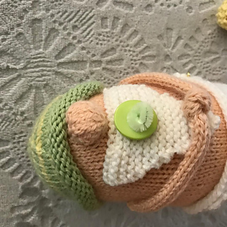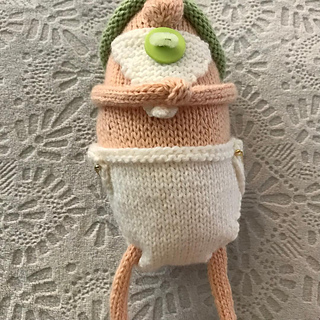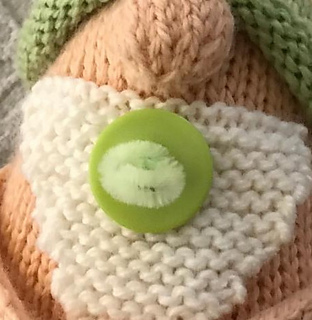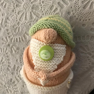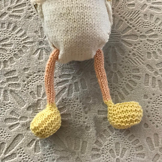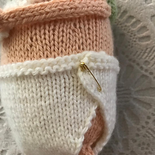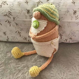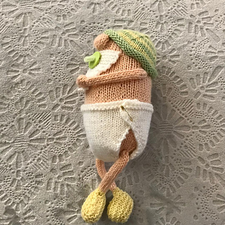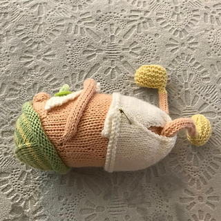 He’s knitted in the round from the top of his baby head to the bottom of his, well, bottom! The diaper is knitted separately. His cute striped baby hat is also separate. Arms and legs are added separately. Nose is knitted in as you go.