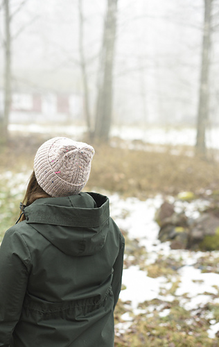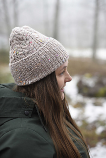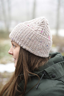 Barley Beanie is a cozy, cabled hat with a deep folded ribbed brim, offering both warmth and a classic silhouette. The beanie is knitted in beautiful tweed yarn from Hedgehog Fibres, blending rustic charm with modern elegance and cute colour pops.