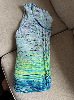Construction is top-down beginning with a provisional cast on of the back stitches. The back neck is shaped with short rows, and the back is worked back and forth with shaping down to the underarms. Stitches for the front straps are picked up from the provisional cast on and the front neck and armholes are shaped. At the underarm, the body is joined to be worked in the round downward.