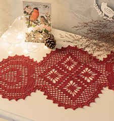 Red filet runner in unusual shape with hearts and spiderwebs.