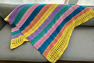 A fun blanket using self striping yarn. Great unisex pattern. Easy row repeat with nice texture. Also can be created in a solid color or variegated yarn.