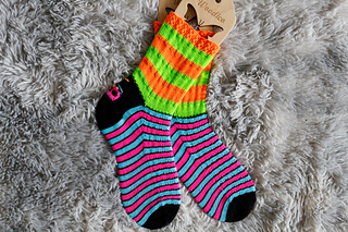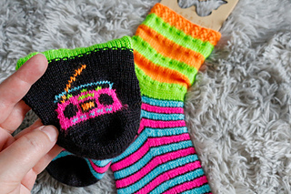 Turn up the volume on your knitting with Boombox Sox—a pattern that hums with retro rhythm and cosy charm. Textured stripes groove along the foot, slouchy legs sway with effortless style, and the heel flap bursts into colour with a bold boombox motif—your own stitched anthem to the mixtape days.