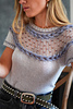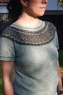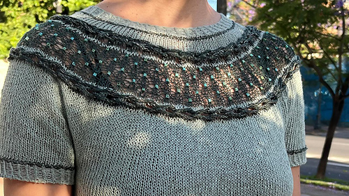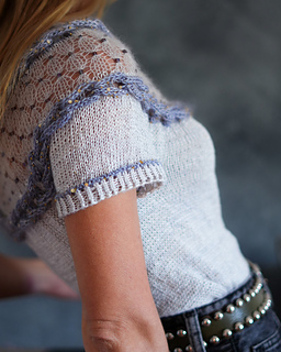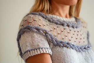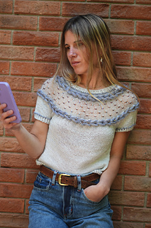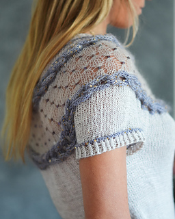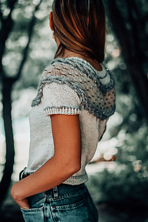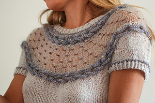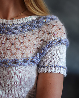 Esta polera está diseñada para esos días frescos de verano. Presenta un delicado motivo calado creado con mostacillas insertadas con un crochet y dos trenzas laterales trabajadas con i-cords. La prenda se teje sin costuras desde arriba hacia abajo, con vueltas cortas en la espalda para dar una forma suave al escote.
