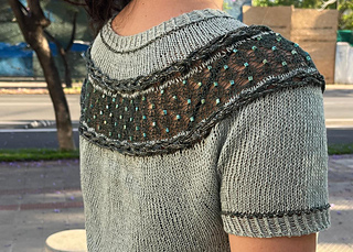 This tee is designed for those fresh summer days. It features a delicate lace motif created with beads inserted using a crochet hook, and two side braids made with i-cords. The piece is worked seamlessly from the top down, with short rows at the back to gently shape the neckline.