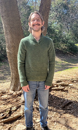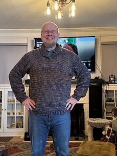 The sweater is worked from the bottom up with minimal seaming (shoulders only). The collar is then added. Finally sleeves are then worked directly from the armhole openings and worked and shaped down to the cuff.