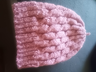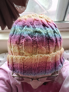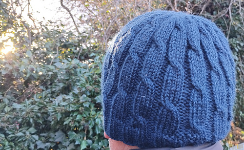 Striking beanie - easy construction. Nice for a beginner cable project as the cables go the same way and look impressive for little effort.