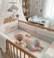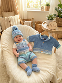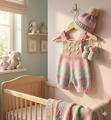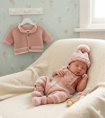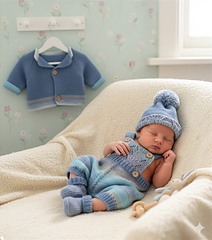 A pretty Dungaree set that is quick to knit up and knitted from the bib downwards. The cardigan is also knitted in one piece from the top down on straight needles, with matching booties and a bobble hat. This simple design which is easy to knit with the line by line instructions looks effective with the variated yarn used.