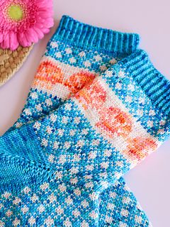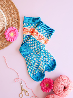 Et pour ajouter une touche de fun, le fond reprend un motif de carreaux qui vous rappellera sans doute une marque de pâtes bien connue. Alors, laissez-vous transporter par ces chaussettes “Coquillettes” et imaginez-vous en balade au bord de l’eau, le sable chaud sous vos pieds et le bruit des vagues en fond sonore. Un petit goût de vacances à tricoter !