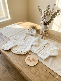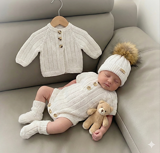 Cotton is a collection of multi-pieces, a unisex romper set, a cardigan and pants set for a girl, and a t-shirt and shorts set for a boy. these pieces can also be mixed and matched to suit. Made using a mixed cotton blend yarn makes these sets suitable for the summer or winter. Knitted from the top down on straight needles with a simple modern stitch pattern makes these pieces easy to knit