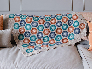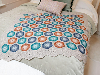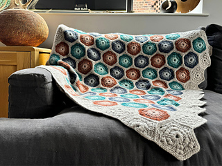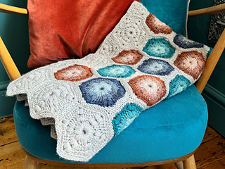 Hexagons are worked over four rounds and half hexagons are worked over four rows. These are then joined together using slip stitches, before a simple slip stitch edge is added around the blanket.