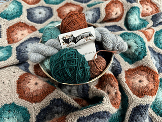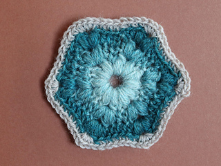 Puff stitches are used with subtle shade changes to create a crocheted flower within each hexagon. Although puff stitches use a lot of yarn, it’s worth it for the resulting texture and warmth they bring to the finished blanket design.