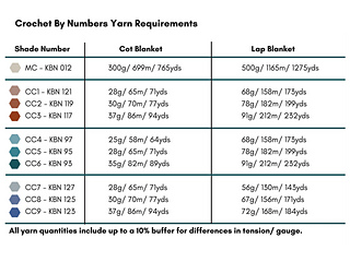 Up to 600g for Cot Blanket and 1120g for Lap Throw. See image for exact yarn requirements per colour.