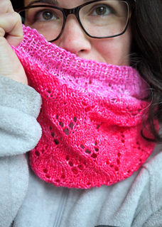 Daphne is a light cowl with a simple lace pattern. A gradient yarn with gradual color changes makes this a fun and eye-catching knit.