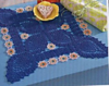 Large blue cross made from pineapples, white and yellow small flower motifs.