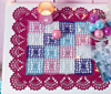 Square doily is made from silver, pink, navy and turquoise square motifs (4x4) with a wine red fan border.