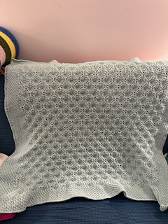 When meeting gauge and working all rows in the pattern, the blanket measures 80 cm or 31.5” across the top and 106 cm or 42” in length.