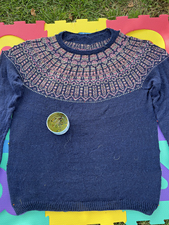 Knit in a deep, rich blue as the main color with bursts of vibrant contrast shades, this pullover truly evokes the light filtering through centuries-old windows. It’s a tribute to artistry, history, and the magic of colorwork.