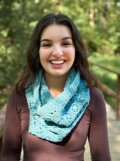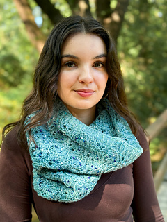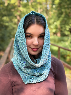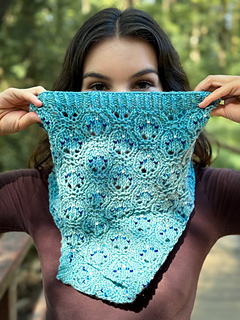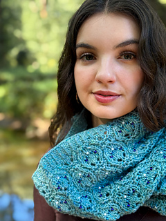 Cowl is worked in the round from the bottom up seamlessly and needs 340 total yards of aran-weight yarn. Smaller needles are used on the bottom and top twisted rib border, while the beaded lace portion is worked in larger needles.