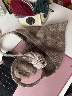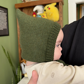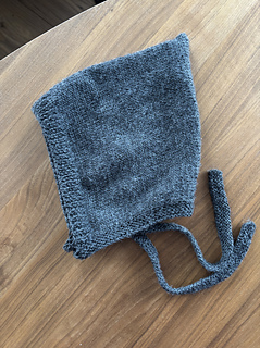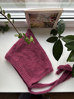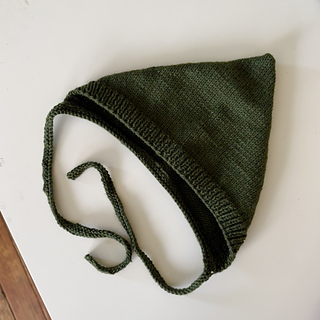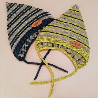 It is worked in one flat piece from the casting on edge rib and working in stocking stitch towards the back of the bonnet, where it has a soft shaping, for the cute pixie peak effect. The hat is then folded in half with a back seam. The bonnet also has a bottom garter stitch edge picked up and knitted afterwards with two straps.