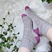 THE FRONT of this gorgeous design is decorated with a panel of cable chevrons separated by little loops; strings of bead-like lace motifs are worked up the sides and back of the leg. Kelly Menzies’ toe-up socks use Cascade Heritage, which comes in a huge choice of colours.