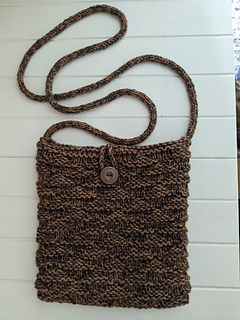 This bag is worked in the round with circular needles. It features a knitted liner, an I-cord strap and button loop, and a lovely geometric pattern.