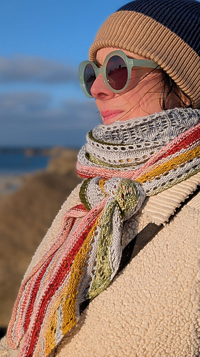 Then, one after another, 12 contrasting colors come in to tell their own stories: each shade introduces a contrasting stripe worked in a different stitch pattern, highlighting a new texture or technique to discover. These colorful sections set the rhythm of the knitting, creating a harmonious blend of colors and motifs.