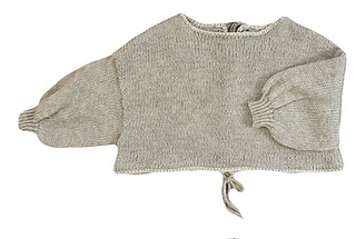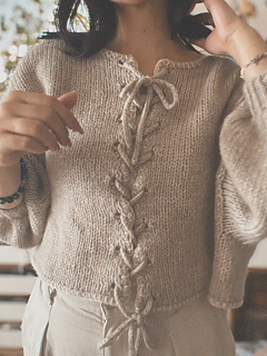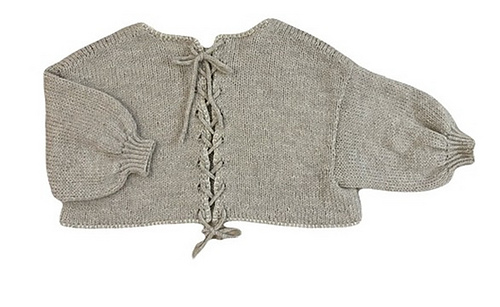 The hem and neckline are finished with a 2-stitch I-Cord Bind Off, followed by a decorative blanket stitch. Finally, two separate I-Cords are knitted and threaded through the back to complete the sweater.