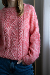 Cozy raglan sleeved sweater with beautiful cables on front. The sweater is worked seamlessly from top down and requires minimal finishing.