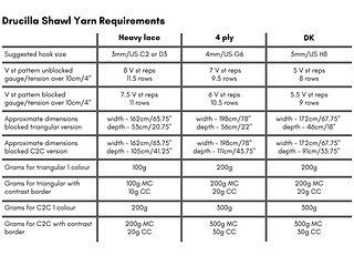 Drucilla Shawl is an eight-page, A4 document with large, clear text, charts, support images and a QR code linking to relevant photo/ video tutorials.