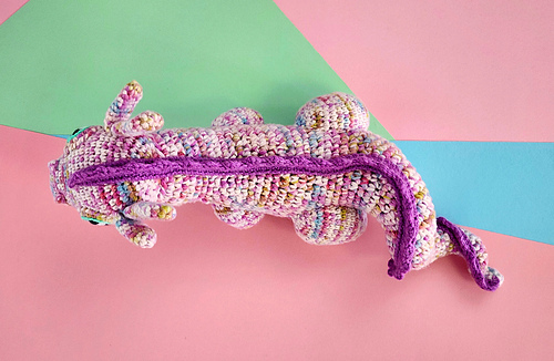 Single strands of yarn are used like normal for all the other pieces to add finer details such as toes with talons, colourful eyes, fins and spines along the dragon’s back.