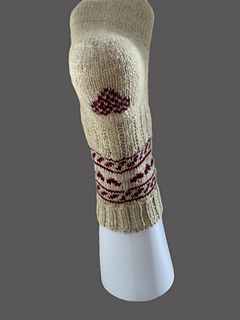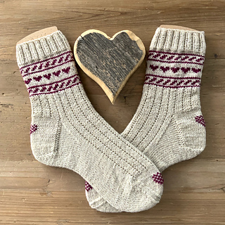 „Edeline“, die Socken „mit Herz“. Sie haben eine Bordüre mit einem Fair-Isle-Herzchen-Muster am Schaft und ein eingestricktes oder auch aufgesticktes Herz an der Ferse und auf der Spitze. Ergänzt durch ein einfaches Rippenmuster an Schaft und Fuß. Alles nicht sehr auffallend, aber mit ganz viel Herz gestrickt. Die Grundlagen des Sockenstrickens und auch vom Fair-Isle Stricken sollten bekannt sein. Ich habe die Ferse als klassische Herzchenferse gearbeitet und eine Bandspitze gestrickt und beschrieben. Ferse und Spitze können jedoch auch anders ausgeführt werden. Man sollte jedoch beachten, dass dort auch die eingestrickten oder aufgestickten Herzchen Platz finden müssen. Die Anleitung enthält Angabe für die Größen 36 bis 47.